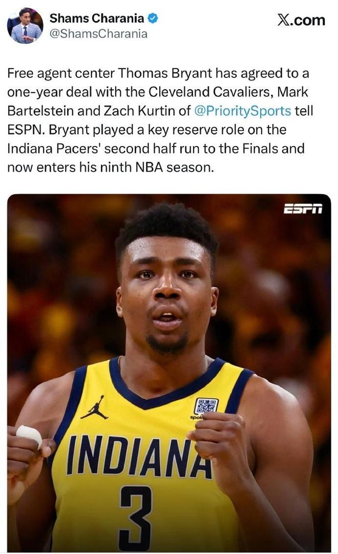 北京时间9月24日,根据ESPN名记Shams Charania报道,湖人旧将中锋托马斯-布莱恩特同意与克利夫兰骑士签订一年合同。布莱恩特上赛季效力步行者,成为板凳席重要轮换,帮助球队晋级总决赛抢七惜败获亚军。
