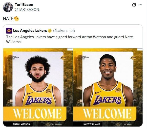 内特-威廉姆斯加盟湖人!老队友伊森转发消息 并送上祝福