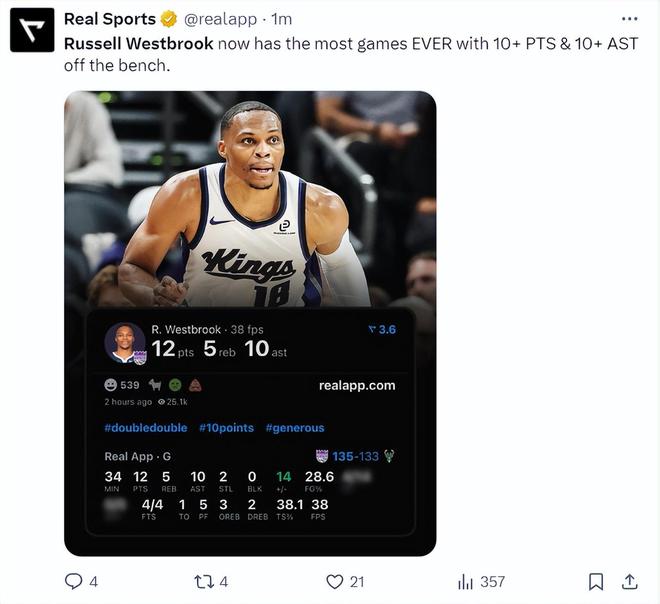 此役威少重返替补席,34分钟,14中4,三分5中0,罚球4中4,拿到12分10助攻5篮板2抢断5犯规1失误,命中率28.6%,三分命中率0%,正负值+14,威少打出国王生涯首次两双。