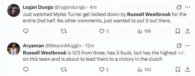 国王球迷们都对威少的表现送上赞誉:整个下半场威少都紧紧贴防迈尔斯-特纳,我只想让大家知道威少很努力;