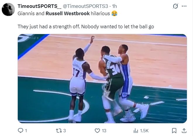 这场比赛威少还贡献了一个名场面,扬尼斯持球突破威少、施罗德两人,威少为了阻挡扬尼斯直接攻框,威少整个人挂在扬尼斯身上,这个熊抱也成为这场比赛最高光的点。