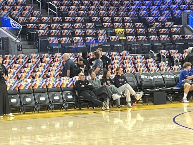 雷速体育10月29日讯 NBA常规赛继续进行,勇士今天在主场迎战快船。勇士记者晒出照片,女武神主教练娜塔莉·中濑和队员伯顿以及凯特·马丁现身勇士主场,在赛前与勇士的防守大师